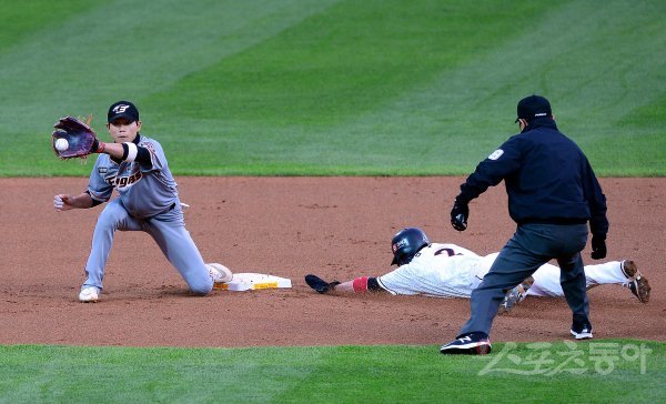 1회말 무사 1루에서 kt 김민혁 타석 때 1루 주자 심우준이 한화 박한결의 수비를 피해 2루 도루에 성공하고 있다.