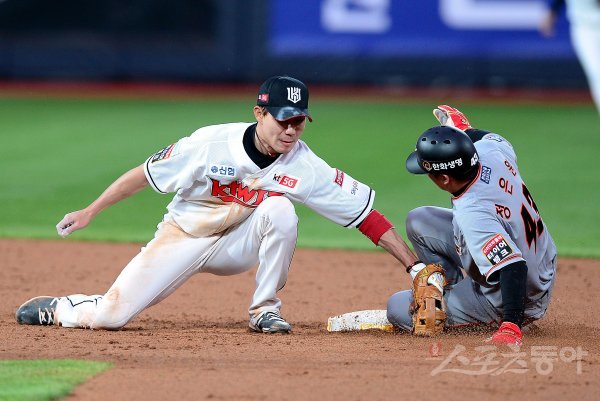 3회초 1사 1루에서 한화 이용규의 내야 땅볼 때 kt 심우준이 1루 주자 정은원을 2루에서 태그했으나 세이프되고 있다.