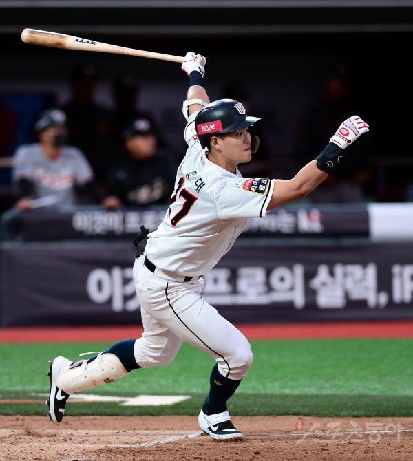 2회말 1사 1루에서 kt 배정대가 1타점 3루타를 날리고 있다.