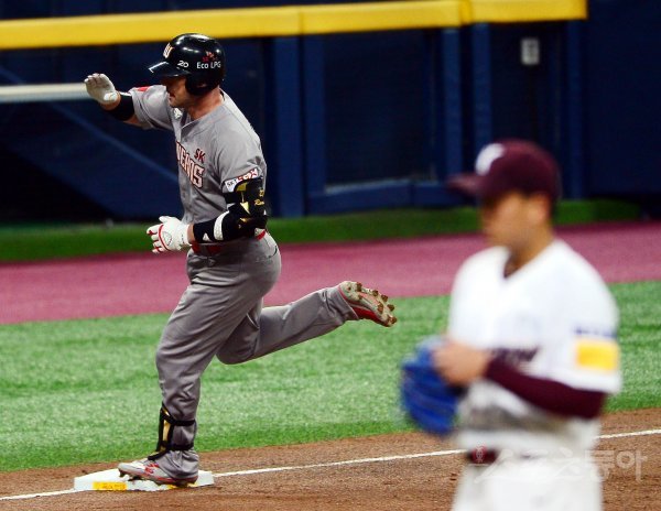 3회초 2사 SK 로맥이 역전 솔로 홈런을 날린 뒤 그라운드를 돌며 세리머니를 하고 있다.