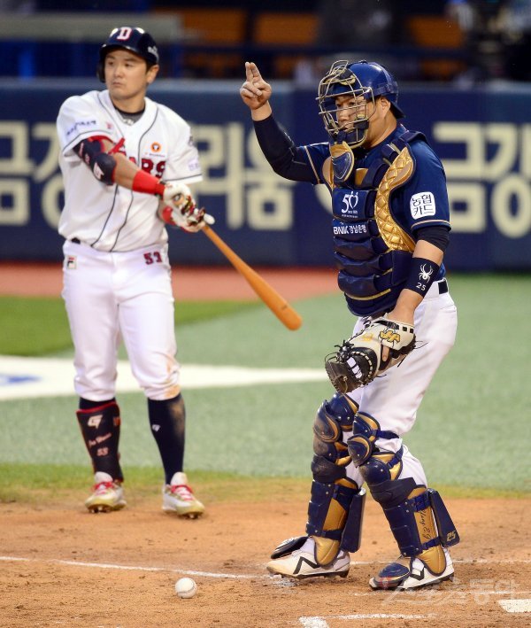 4회말 2사 NC 양의지가 두산 최주환의 배트가 돌아갔다며 심판에게 어필하고 있다.