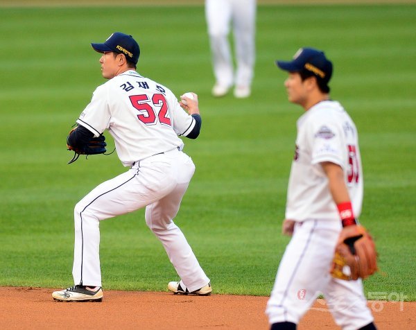 2회초 2사 2루 상황에서 두산 김재호가 땅볼 타구를 실책하고 있다.