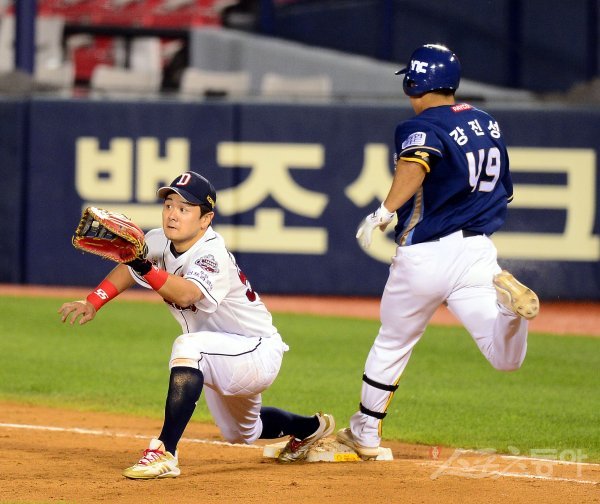 8회초 무사 NC 강진성 내야 안타 때 두산 최주환이 1루수를 맡고 있다.