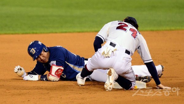 9회초 1사 NC 양의지가 좌전 안타를 치고 2루에서 세이프 되며 두산 오재원과 충돌해 부상을 당하고 있다.