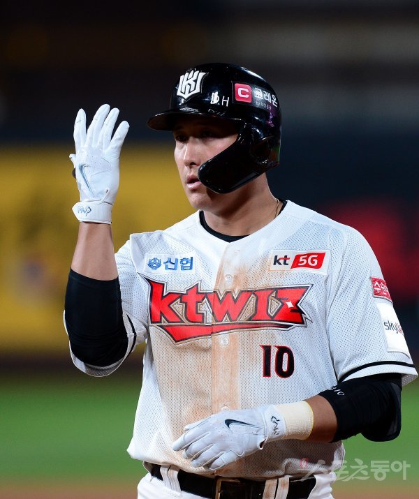 6회말 2사 2루에서 kt 황재균이 1타점 적시타를 날린 뒤 세리머니를 펼치고 있다.
