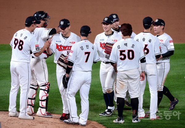 kt가 한화에 8-1로 승리하며 5연승을 기록한 뒤 선수들이 그라운드에서 기쁨을 나누고 있다.