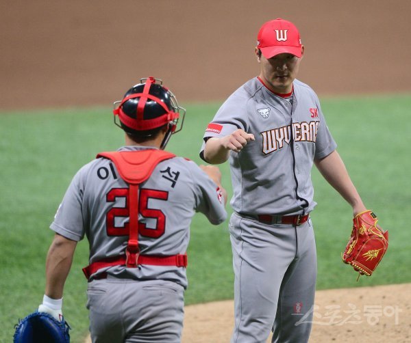 SK가 키움을 5-3으로 승리로 10연패를 끊은 뒤 하재훈이 포수와 기쁨을 나누고 있다.