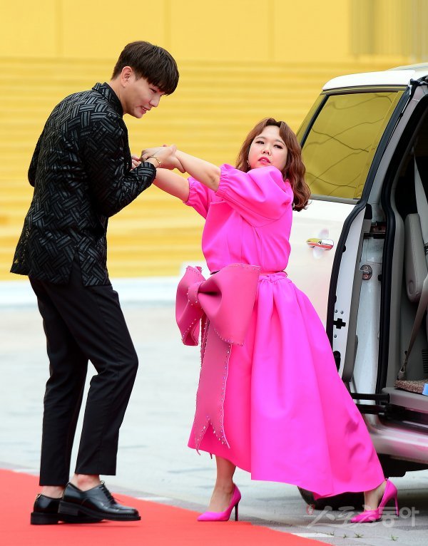 21일 인천 영종도 인천 파라다이스시티 스튜디오 파라다이스에서 열린 TV조선 ‘아내의 맛’ 100회 특집 포토행사에 참석한 홍현희, 제이쓴 부부가 차에서 내리고 있다.