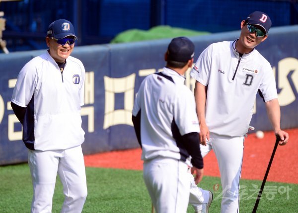 NC 채종범 코치와 두산 고영민 코치가 경기에 앞서 환하게 웃고 있다.