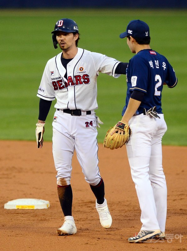 2회말 무사 1루 두산의 내야 땅볼 때 두산 오재원이 슬라이딩 과정 중 충돌한 NC 박민우에게 사과하고 있다.