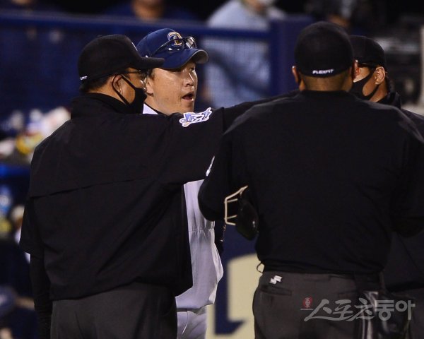 5회초 2사 1, 2루 두산의 적시타 때 NC 이동욱 감독이 추가 진루가 인정되어 2실점을 한 뒤 심판에게 항의하고 있다.