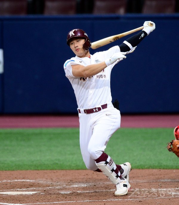 5회말 무사 2, 3루에서 키움 김하성이 2타점 2타점 2루타를 날리고 있다.