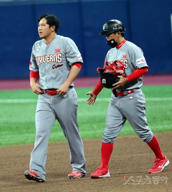 5회초 2사 1루에서 SK 최정이 3루수 땅볼 아웃으로 물러난 뒤 조동화 코치의 위로를 받고 있다.