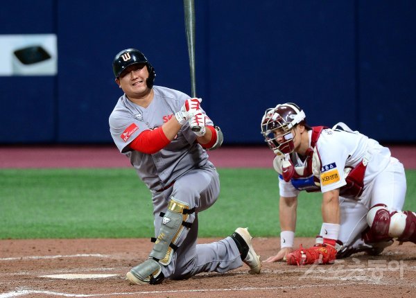 6회초 1사 3루에서 SK 대타 남태혁이 헛스윙 삼진 아웃을 당하고 있다.