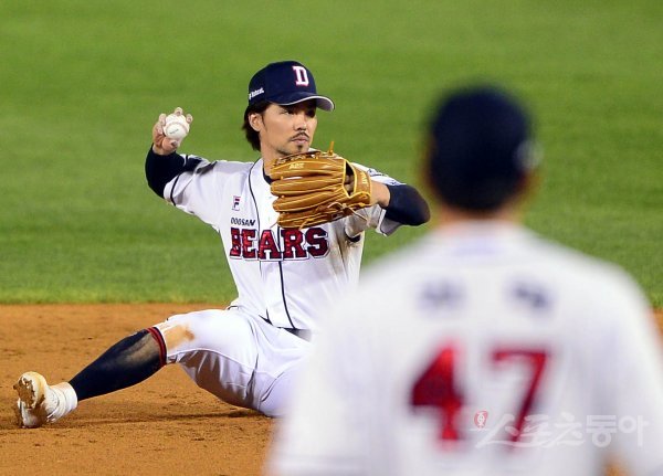 9회초 무사 NC의 내야 땅볼 때 두산 2루수 오재원이 앉아서 송구하고 있다.