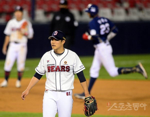 9회초 1사 1, 3루 NC 3점 홈런 때 두산 최원준이 아쉬워하고 있다.