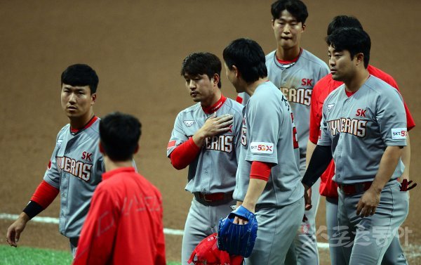 연장 10회말 무사 2루에서 키움 박정음에게 끝내기 안타로 패한 SK 선수들이 그라운드를 빠져나가고 있다.