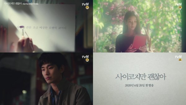 22일 ‘사이코지만 괜찮아’ 제작진이 공개한 티저 영상에는 펜으로 빠르게 글자를 지워나가는 누군가의 손길이 담겨 있다. 흰 종이 위 ‘사이코’라는 세 글자 사이사이로 ‘사랑에 관한 조금 이상한 로맨틱 코미디’란 메시지가 선명해지면서 신선하고 독특한 이야기가 펼쳐질 것을 기대케 한다.