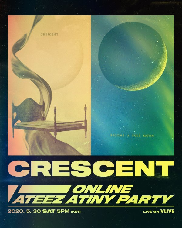 에이티즈는 오는 30일 오후 5시(KST)에 네이버 V LIVE를 통해 ‘에이티즈 온라인 에이티니 파티 ‘크레센트’(ATEEZ ONLINE ATINY PARTY ‘CRESCENT’)’를 개최한다고 밝혔다. 단순한 팬미팅을 떠나 에이티즈의 팬덤명인 ‘에이티니(ATINY)’ 파티라고 칭하며, 서로 소통하고 즐기는 자리를 꾀한 것.
