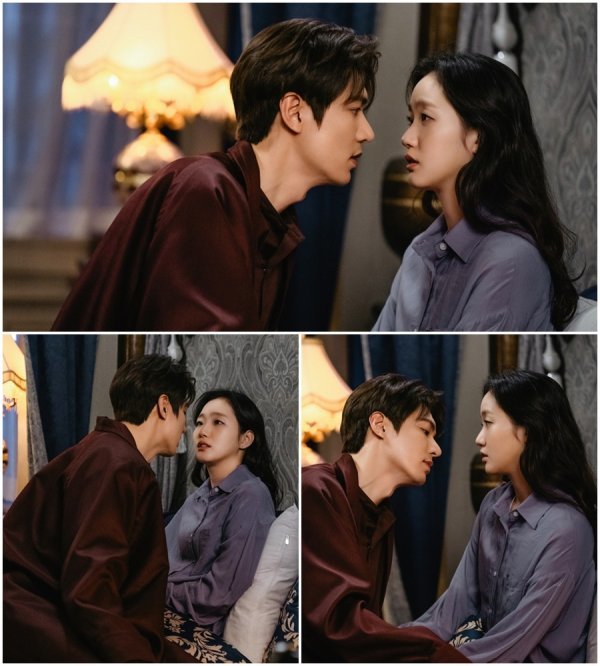 이와 관련 이민호와 김고은이 침소에서 벌인 아찔한 스킨십이 포착됐다. 극중 이곤과 정태을이 섬광처럼 타오르는 감정선을 드러내는 장면. 두 사람이 침대 위에 나란히 앉아 있는 가운데, 이곤은 정태을을 뚫어지게 쳐다보며 꼼꼼히 상태를 살피고, 정태을은 어느새 어깨를 드러내는 심쿵 순간이 이어진다. 이어 서로를 쳐다보는 눈빛이 뜨거워지던 두 사람이 치명적인 키스를 나누는 ‘기승 전 입맞춤’ 분위기가 연출되는 것. 과연 두 사람의 서로에게 확인하려고 했던 바는 무엇일지, 다사다난한 위기를 견뎌내고 있는 두 사람의 로맨스는 어떻게 전개될지 궁금증이 증폭된다.