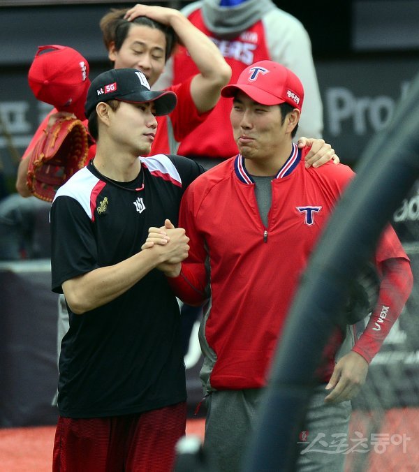 경기 전 kt 심우준이 KIA 유민상과 이야기를 나누고 있다.