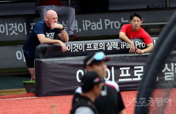 경기 전 KIA 윌리엄스 감독이 kt 훈련을 지켜보고 있다.