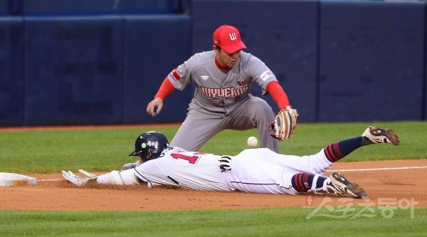 3회말 무사 두산 허경민이 3루타를 날린 뒤 슬라이딩하고 있다.