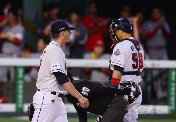 5회초 2사 1, 3루 SK 노수광의 역전 적시타 때 두산 플렉센이 아쉬워하고 있다.