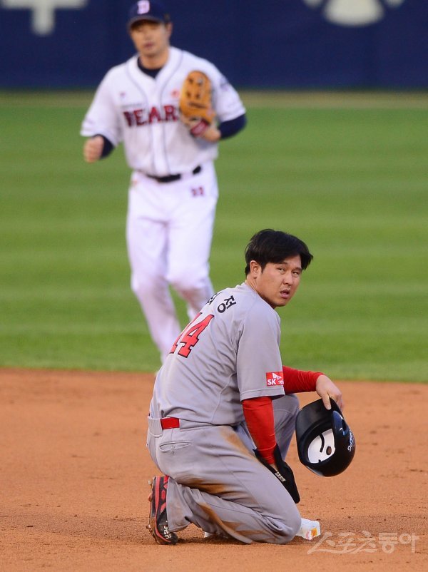 4회초 2사 SK 로맥의 내야 땅볼 때 1루주자 최정이 포스 아웃당한 뒤 아쉬워하고 있다.