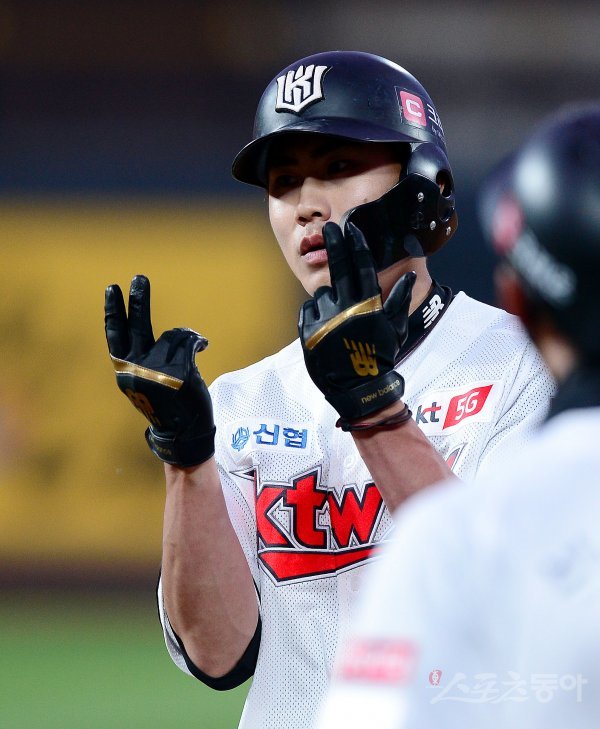 3회말 2사 1루에서 kt 심우준이 안타를 날린 뒤 세리머니를 펼치고 있다.