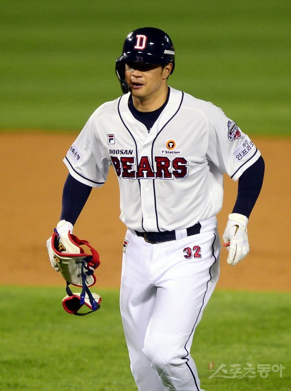 8회말 2사 1, 2루 두산 김재환이 2타점 좌전 2루타를 날린 뒤 교체돼 더그아웃으로 향하고 있다.