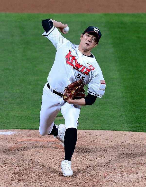 7회초 무사 1, 3루에서 kt 유원상이 구원 등판해 볼을 던지고 있다.