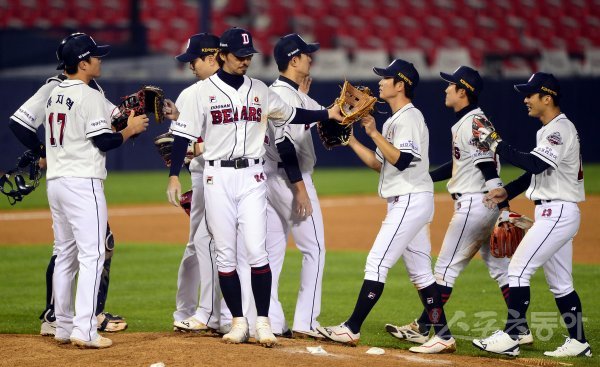 두산이 SK에게 6-4로 승리한 뒤 선수들이 기쁨을 나누고 있다.