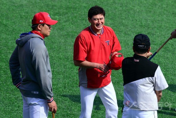 경기 전 KIA 최희섭, 서쟁응 코치와 kt 김태균 코치가 이야기를 나누고 있다.