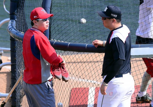 경기 전 KIA 양현종과 kt 김강 코치가 이야기를 나누고 있다.