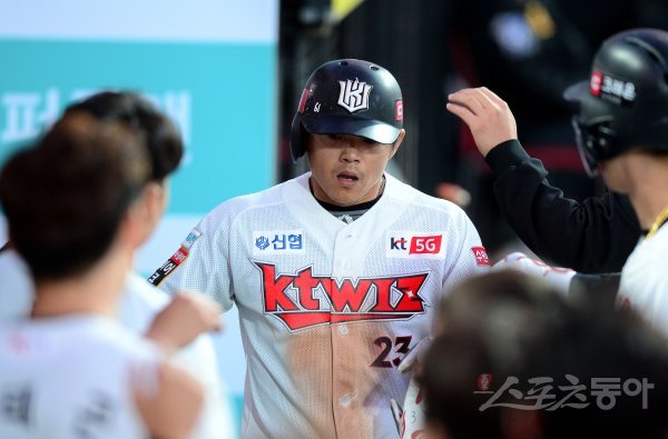 4회말 무사 1루에서 kt 로하스의 1타점 2루타 때 득점에 성공한 조용호가 동료들의 환영을 받고 있다.
