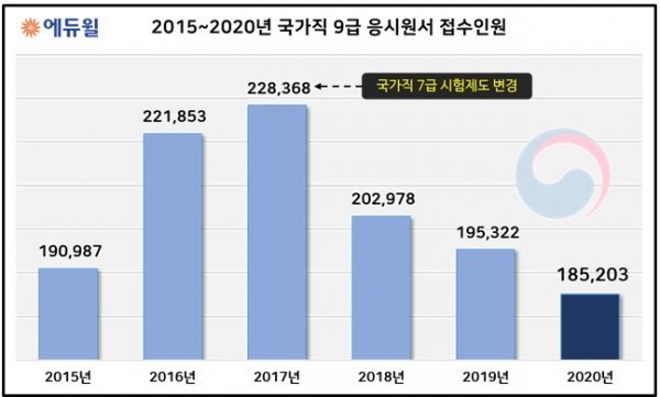 최근 3년간 국가직 9급공무원 지원자 규모는 2018년 20만2978명, 2019년 19만522명, 2020년 18만5203명을 기록하며 3년 연속 감소 추세에 있다. 반면 3년간 국가직 9급공무원 선발인원은 역대 최고 수준인 6000명 이상을 기록했다.