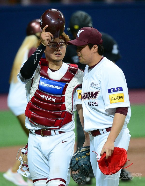 7회초 2사 1, 2루에서 구원 등판한 키움 이영준이 kt 배정대를 아웃시킨 뒤 이지영과 이야기를 나누고 있다.