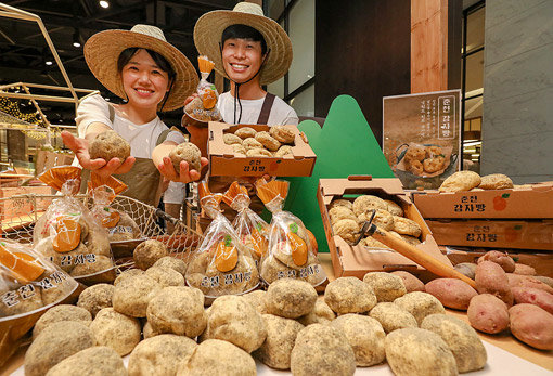 현대백화점이 4일까지 서울 압구정본점 지하 1층 식품 매장에서 ‘카페, 감자밭’ 팝업스토어를 운영한다. 강원도 춘천에서 2대째 감자 농사를 짓는 청년 농부 부부가 운영하는 카페다. 산지에서 직접 수확한 감자로 만든 감자빵이 SNS를 통해 입소문이 났다. 감자처럼 생긴 감자빵의 특징을 살려 신선식품 매대처럼 꾸몄다.