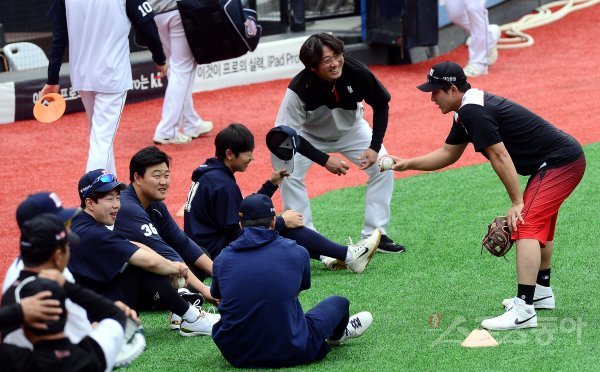 경기 전 kt 황재균이 두산 훈련에 나타나 선수들과 이야기를 나누고 있다.