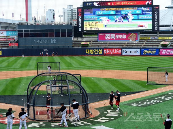 경기 전 kt 선수들이 타격을 훈련할 때 상대 선발 유희관의 투구가 전광판을 통해 보여지고 있다.