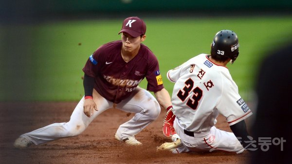 2회말 2사 1루 상황에서 1루주자 한화 정진호가 2루 도루에 성공하고 있다.