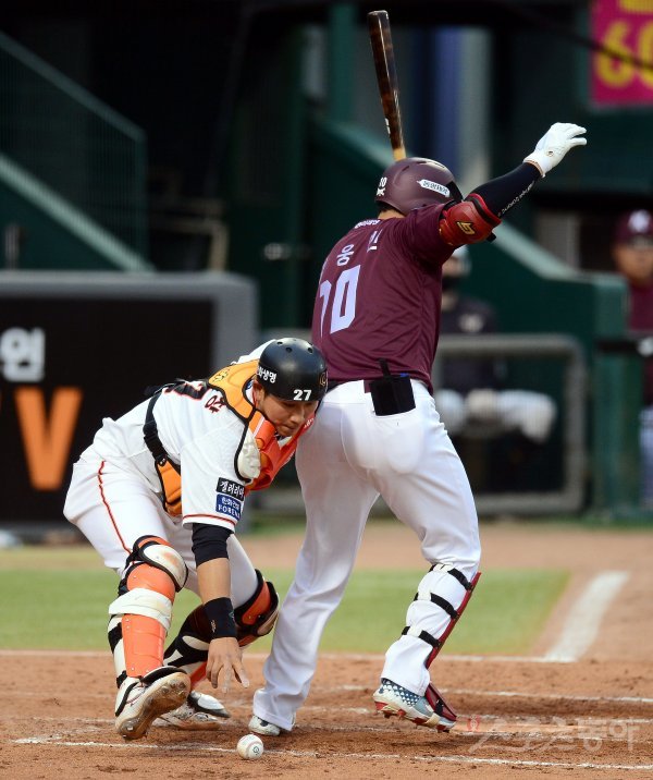 3회초 한화 포수 이해창이 블로킹으로 그라운드에 떨어진 공을 잡고 있다.