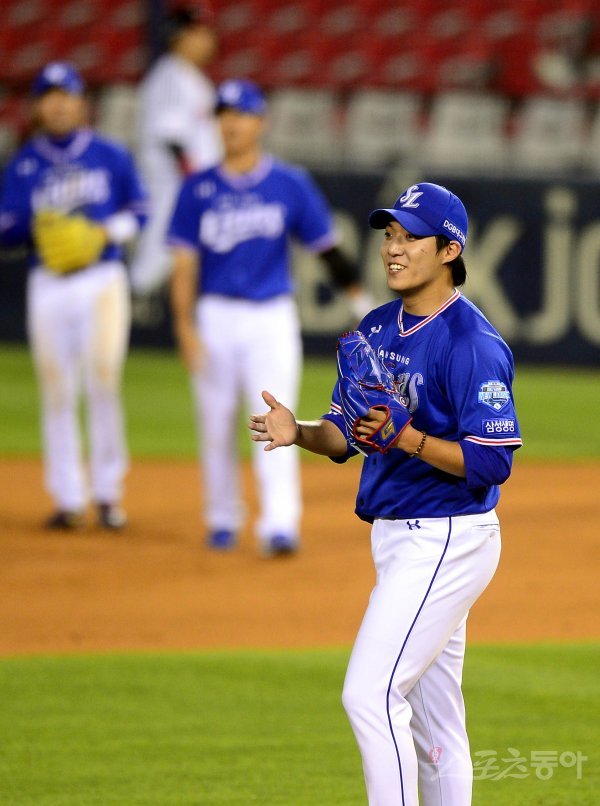 5회말 1사 LG 유강남의 내야 땅볼 때 삼성 원태인이 호수비를 펼친 3루수를 향해 박수치고 있다.