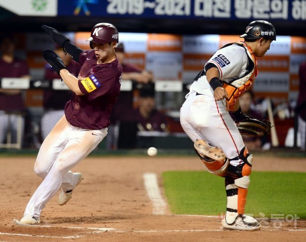7회초 1사 2루 키움 안타 때 2루주자 김혜성이 홈까지 달려 세이프 되고 있다.