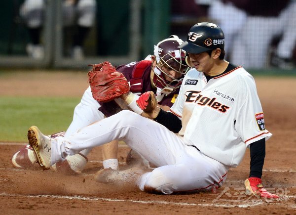 4회말 2사 1루 한화 적시타 때 2루주자 정진호가 홈까지 달렸으나 아웃되고 있다.