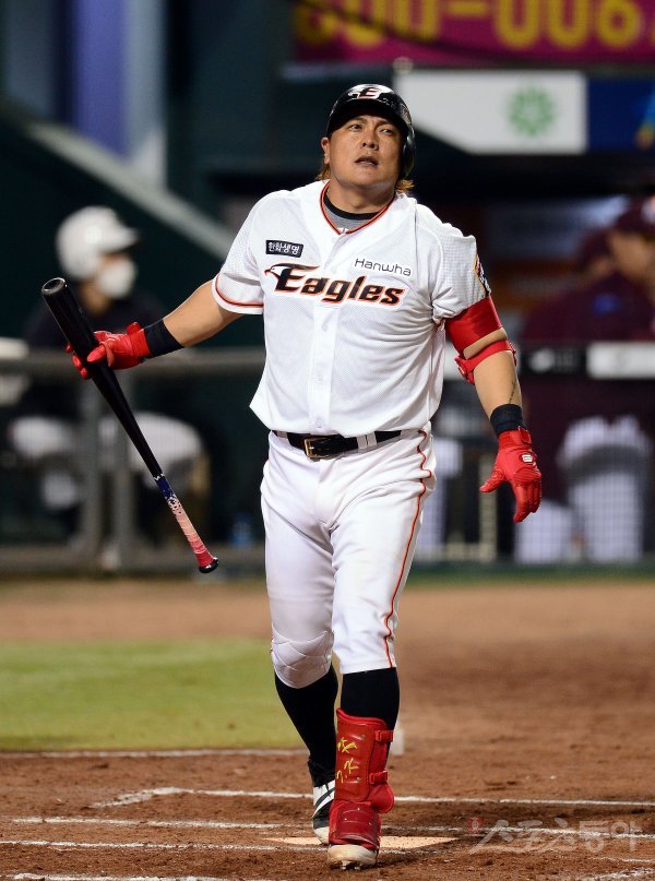 14일 만에 1군에 복귀한 한화 김태균이 6회말 2사 상황에서 삼진 아웃을 당하고 있다.