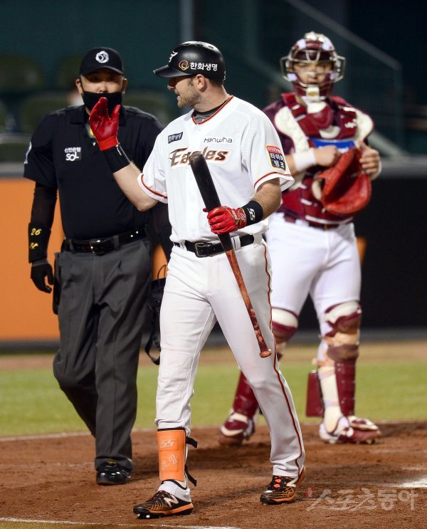 6회말 무사 한화 호잉이 삼진 아웃을 당한 후 볼 판정에 대해 항의하고 있다.
