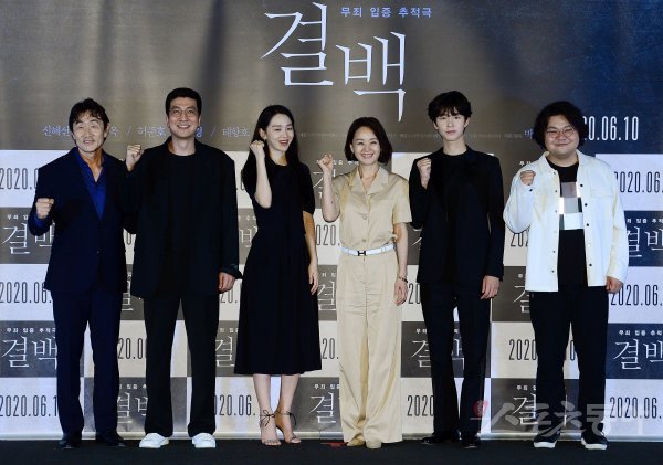 4일 서울 용산구 CGV 용산아이파크몰에서 열린 영화 ‘결백’ 시사회에 참석한 배우 허준호(왼쪽부터), 박상현 감독, 신혜선, 배종옥, 홍경, 태항호가 카메라를 향해 포즈를 취하고 있다.