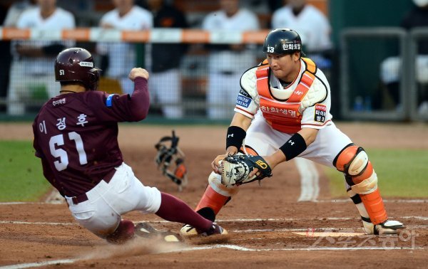 3회초 1사 2,3루 한화 폭투 때 3루주자 이정후가 홈으로 달렸으나 한화 최재훈에게 태그 아웃되고 있다.
